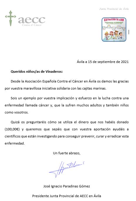 Hoy hemos recibido esta carta de la Asociación Contra el Cáncer de Ávila. Tenemos que sentirnos muy orgullosos de nuestros niños, que tuvieron la idea de enviar lo recaudado con sus manualidades para ayudar a niños con cáncer